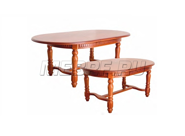 Недорогой раздвижной стол из массива дерева с элементами резьбы. Можно использовать в гостиных, кухнях, столовых, а также ресторанах и кафе.